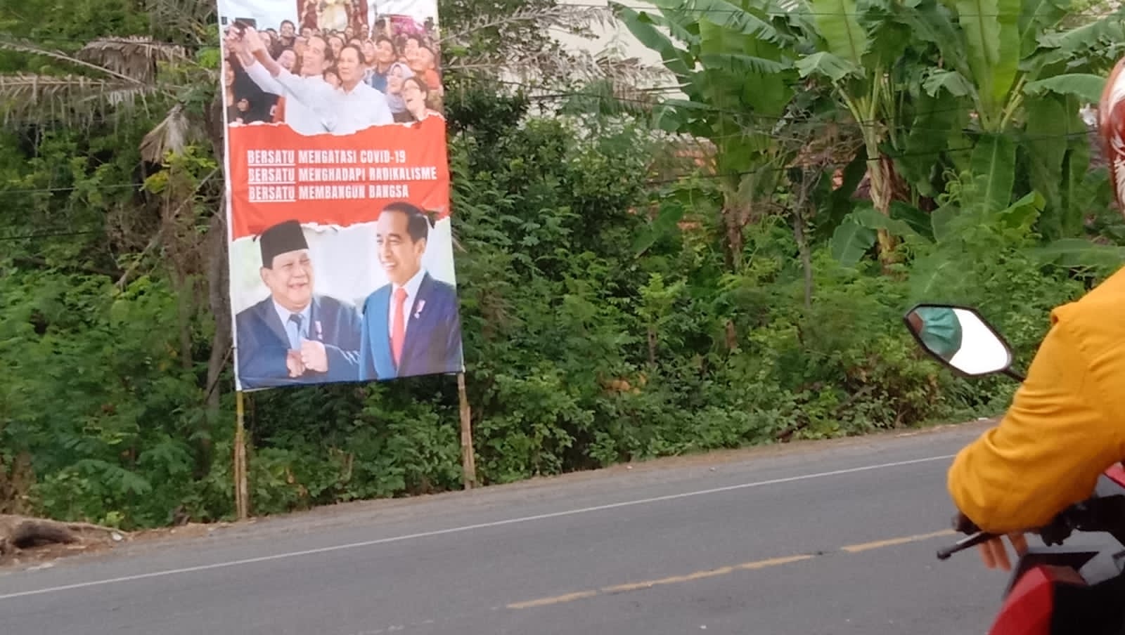 Spanduk Presiden Joko Widodo bersama Menhan Prabowo Subianto yang terpasang di jalan Pantura Jawa Tengah, di depan pintu obyek wisata Pantai Pasir Putih Wates, Rembang.