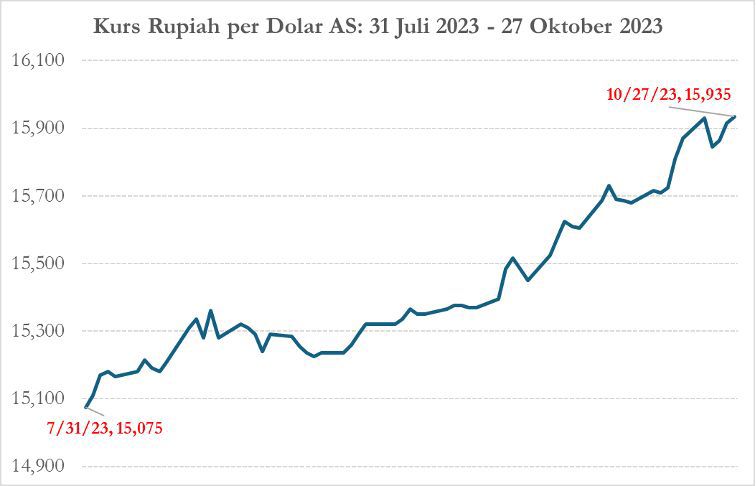 Dampaknya sangat serius, kurs rupiah anjlok dari sekitar Rp15.000 pada akhir Juli 2023 menjadi Rp15.935 per dolar AS pada akhir Oktober 2023.