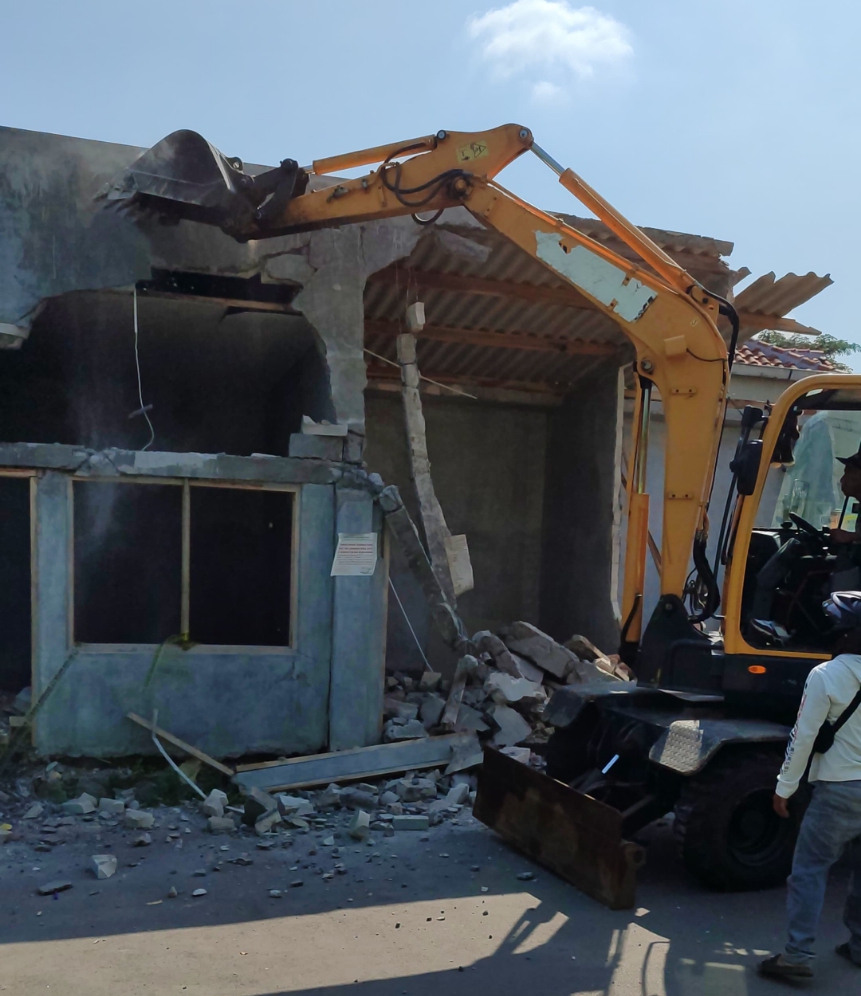 Semarang – Pembangunan 5 (lima) kios dan 1 (satu) bangunan yang direncanakan untuk CAFÉ di Kelurahan Bambankerep, Kecamatan Ngaliyan Kota Semarang akhirnya dibongkar paksa Satpol PP Kota Semarang. Diketahui sebelumnya, pembangunan kios yang berdiri diatas tanah fasum tersebut telah dilaporkan oleh 8 Ketua RT, 1 Ketua Takmir Masjid dan 2 Tokoh masyarakat melalui Satpol PP dan Dinas Tata Ruang (Distaru) Kota Semarang.