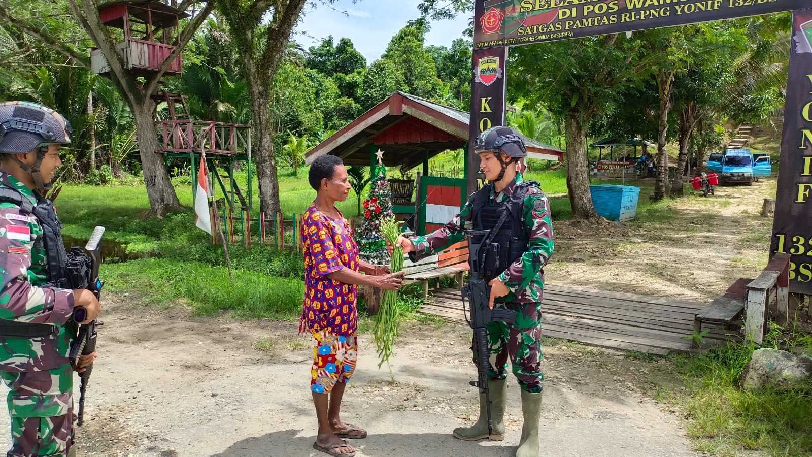 Kab. Keerom | patrolinusantara.press – Satgas Yonif 132/BS membagikan sayuran hasil panen secara gratis kepada masyarakat yang melintas di depan Pos Wambes yang terletak Di Kp. Wambes, Distrik Mannem, Kab. Keerom, Provinsi Papua, Selasa (04/04/2023).