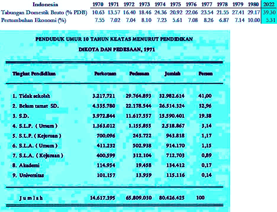 Masih periode 1970-1980. Tabungan masyarakat ketika itu jauh lebih rendah dari tabungan masyarakat saat ini. Rasio tabungan (% PDB) pada 1970 hanya 10,63 persen, dan 1980 naik menjadi 29,17 persen. Tetapi, faktanya, pertumbuhan ekonomi periode 1970-1980 mencapai di atas 7-8 persen. Sedangkan rasio tabungan (% PDB) saat ini mencapai 39,3 persen.