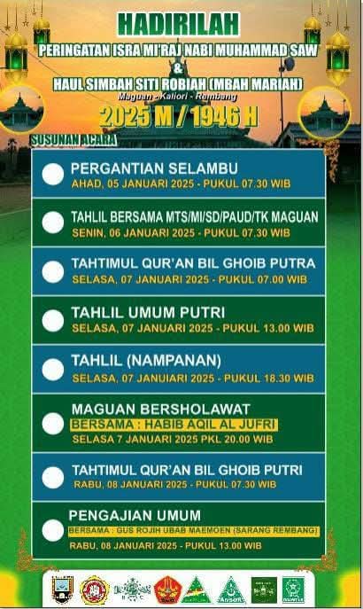 Rembang – Dalam rangka Peringatan Isra Mi’raj Nabi Muhammad SAW dan Haul Simbah Siti Robiah (Mbah Mariyah), masyarakat bersama Pemerintah Desa Maguan Kecamatan Kaliori Kabupaten Rembang akan menggelar berbagai rangkaian kegiatan religi mulai tanggal 5-8 Januari 2025.
